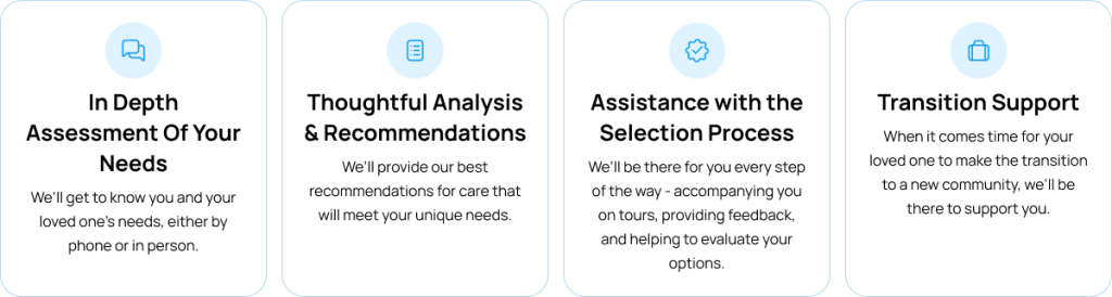 The most optimal services are adapted to meet specific needs—whether that includes help with daily tasks. Our senior care advisors bridge the gap to help families find appropriate care in their general vicinity. If you’re seeking assisted living options or simply looking into senior home care services, our team of senior care advisors will guide you in discovering the best match. These are only a handful of the ways in which we can serve you:
